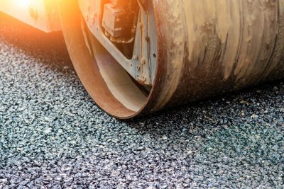 120度程度の熱さアスファルトを転圧機械で上から圧縮することで、締固めます。